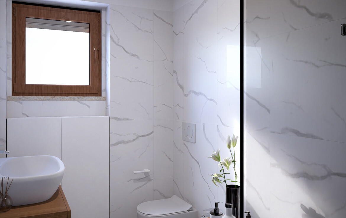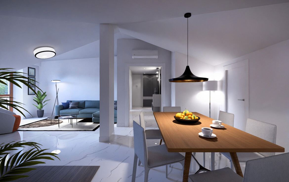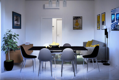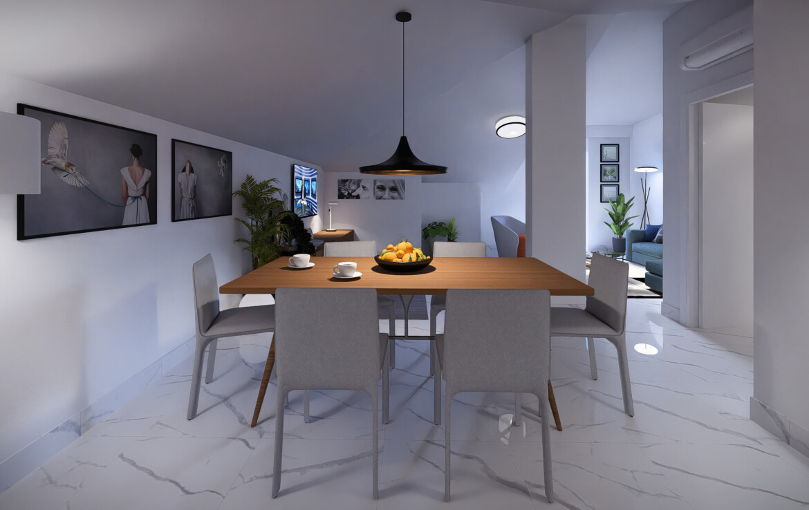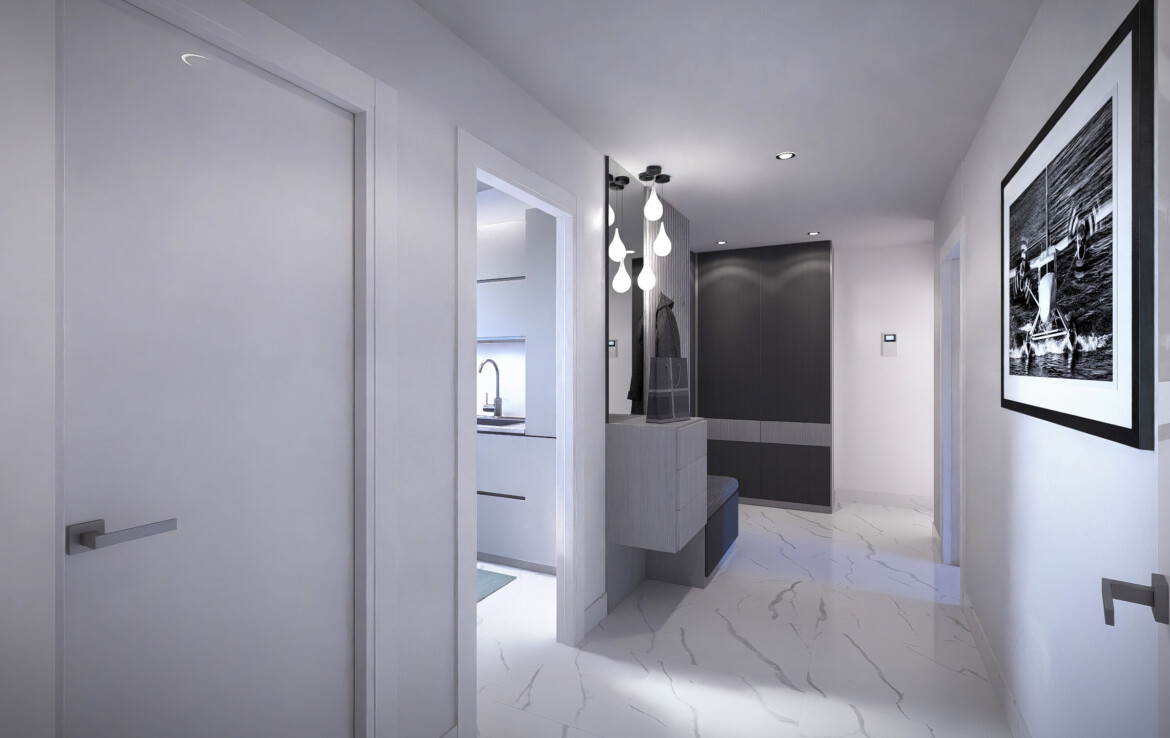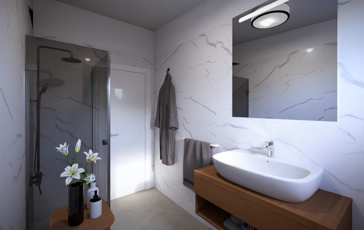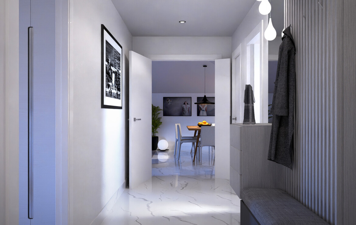 Materiali e finiture di qualità definiscono un’estetica sobria e contemporanea: pavimenti in grès porcellanato effetto marmo amplificano la luminosità degli ambienti, mentre gli infissi effetto legno aggiungono calore.