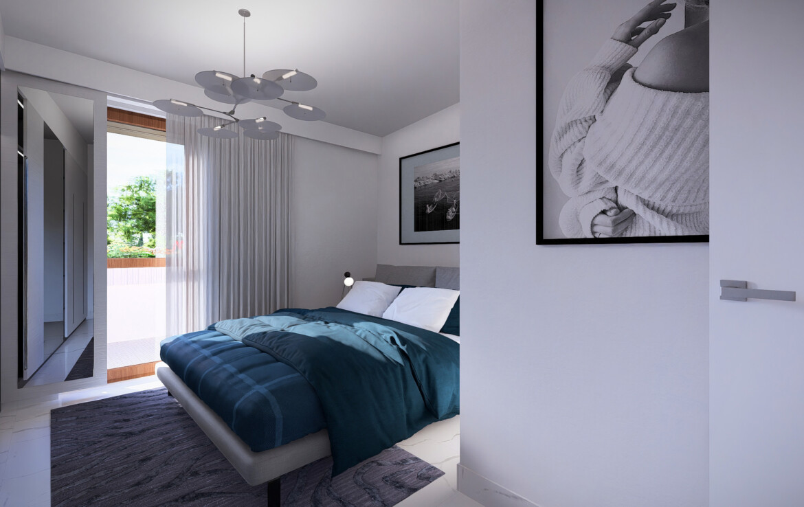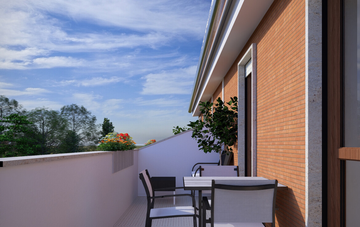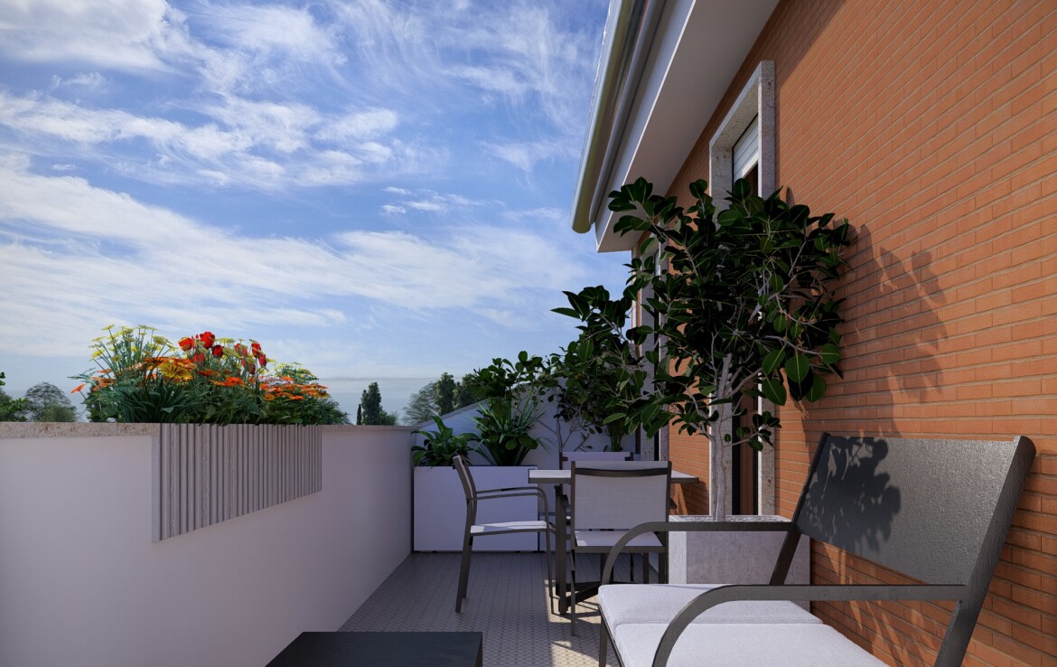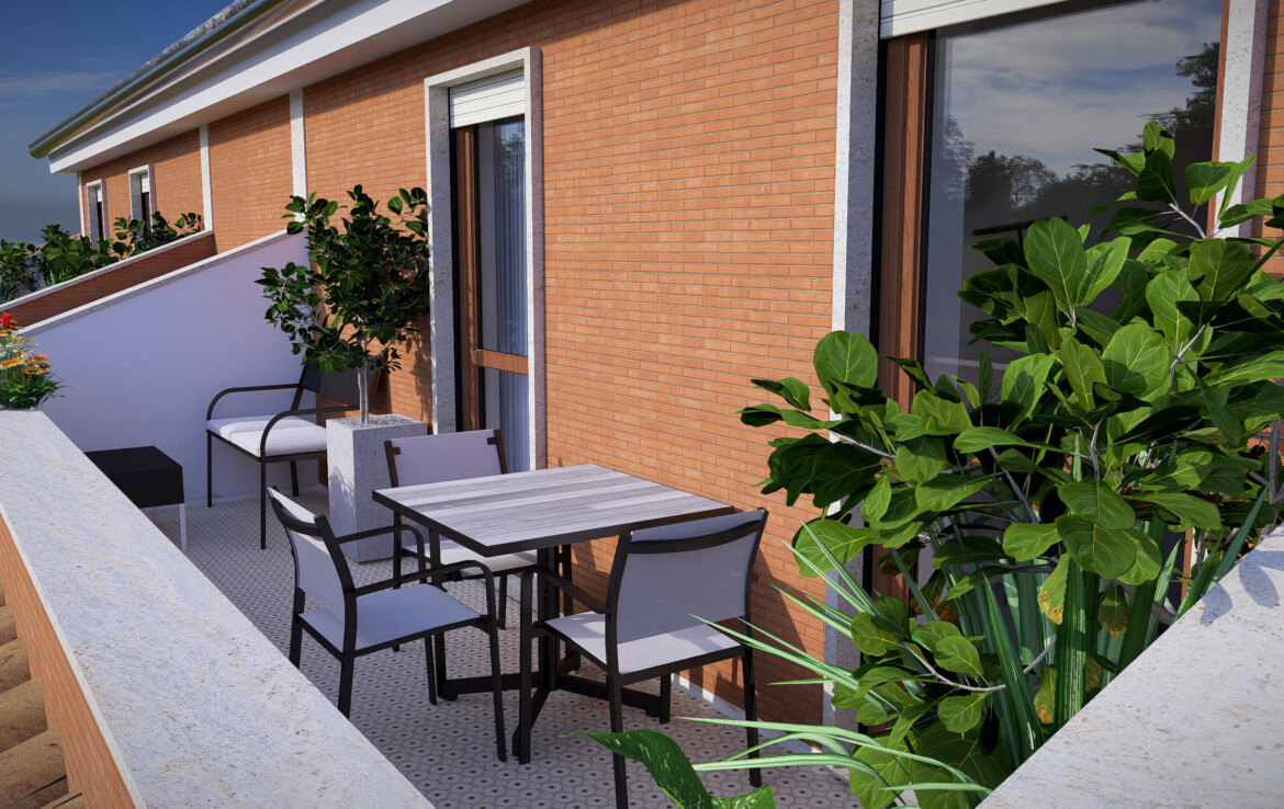 La camera da letto e il soggiorno si affacciano su un ampio balcone di 20 mq, un’estensione naturale della casa da vivere in ogni stagione, tra luce e aria aperta.