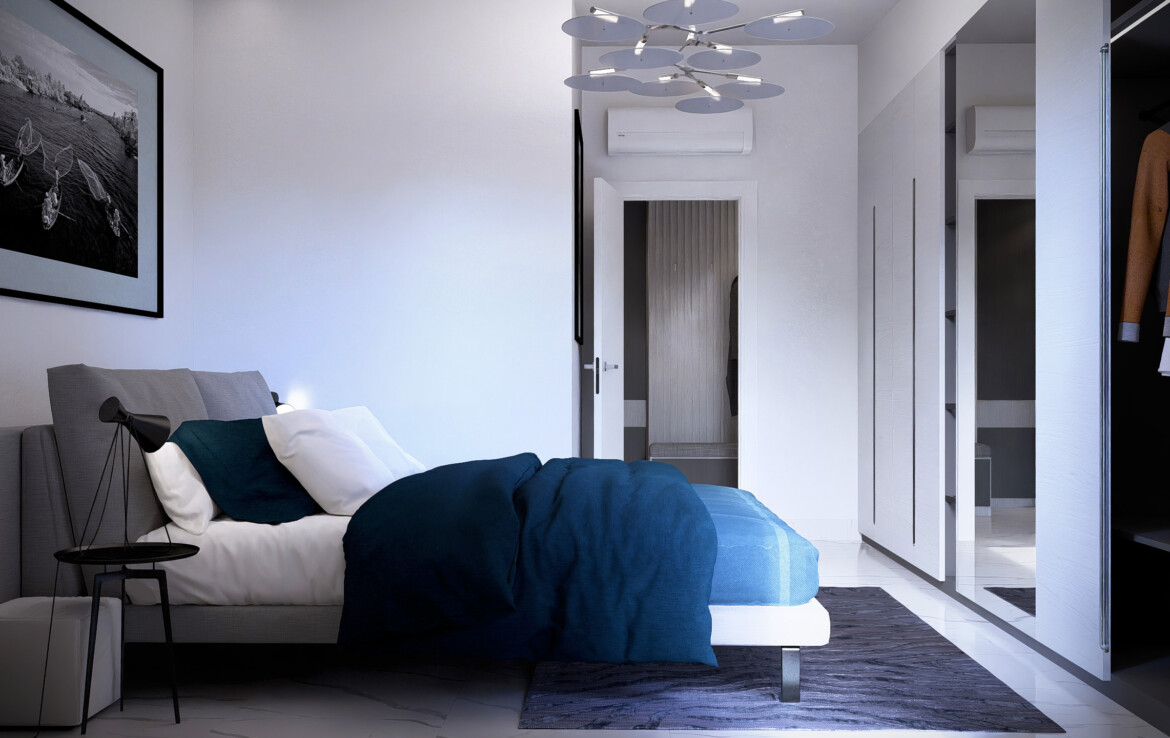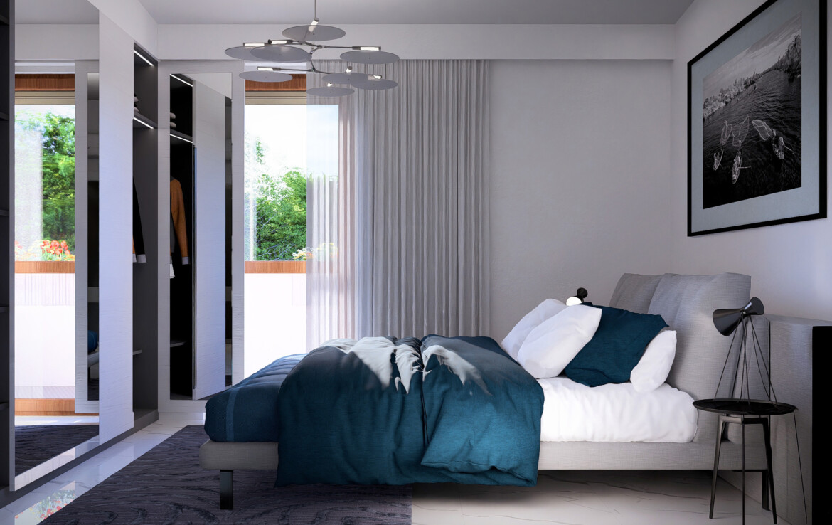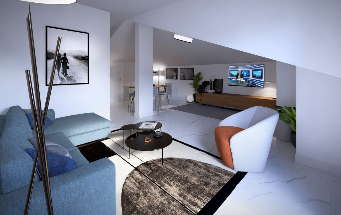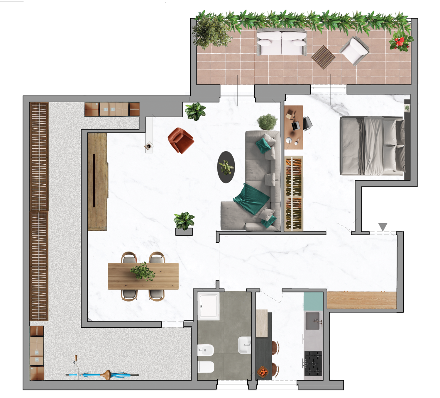La camera da letto e il soggiorno si affacciano su un ampio balcone di 20 mq, un’estensione naturale della casa da vivere in ogni stagione, tra luce e aria aperta.