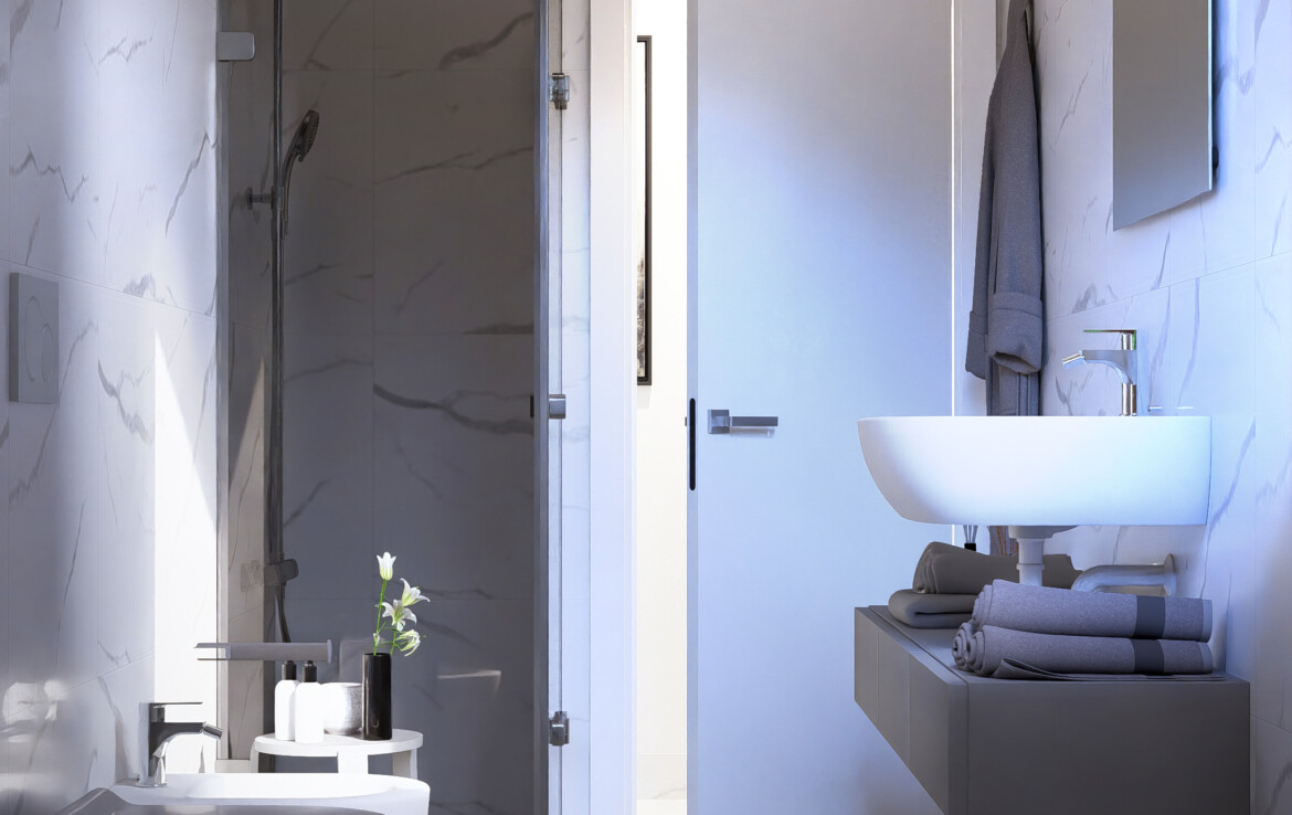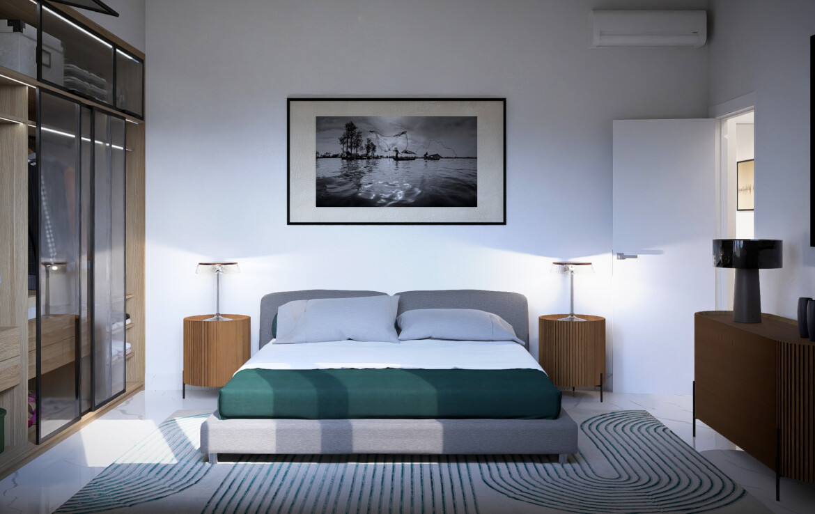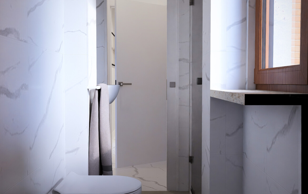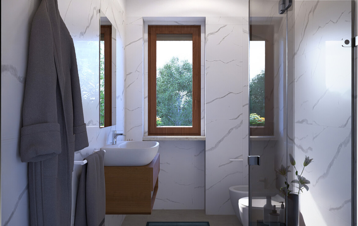 Le finiture ricercate e i pavimenti in grès porcellanato effetto marmo creano un equilibrio tra stile e comfort.