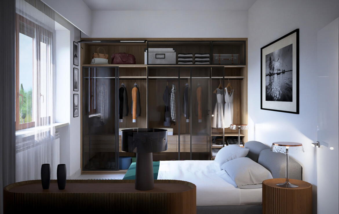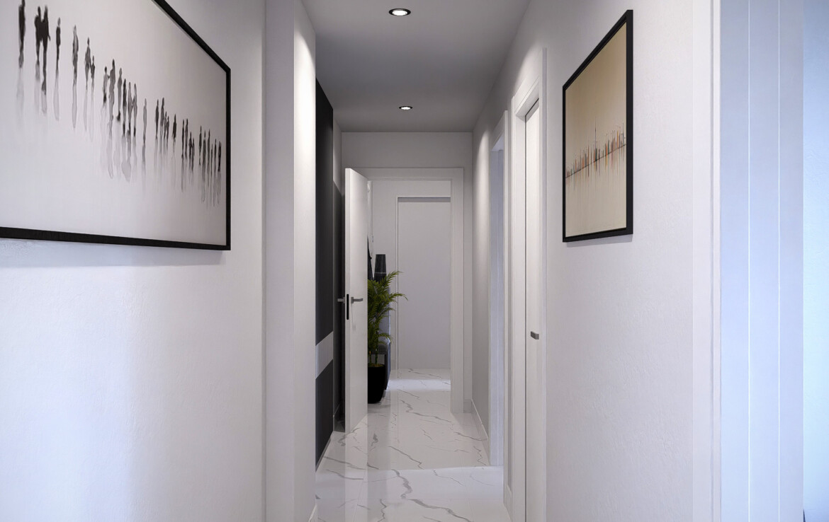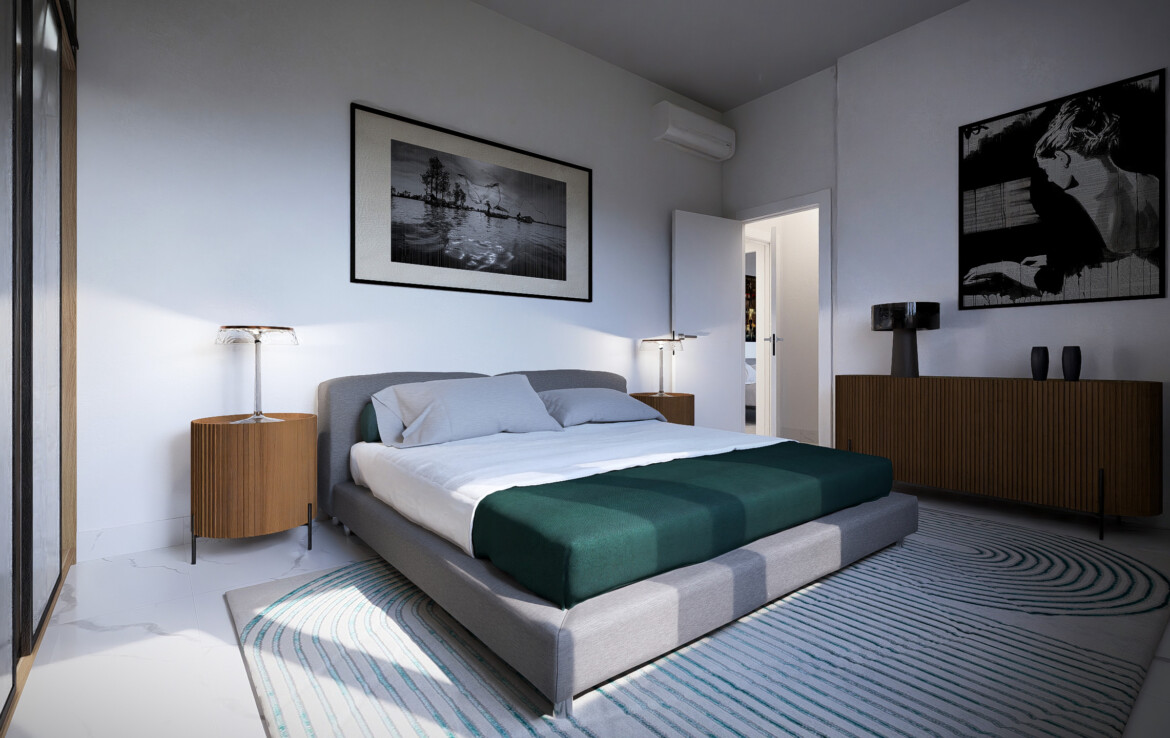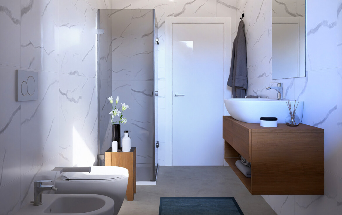 Le finiture ricercate e i pavimenti in grès porcellanato effetto marmo creano un equilibrio tra stile e comfort.